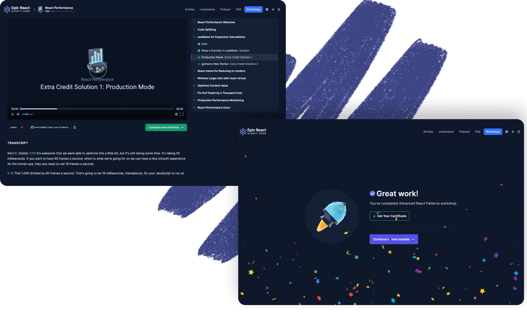 We handled all the development and infrastructure work for Epic React, with Joel Hooks serving as the technical architect and lead developer and Ian Jones supporting the back-end development.